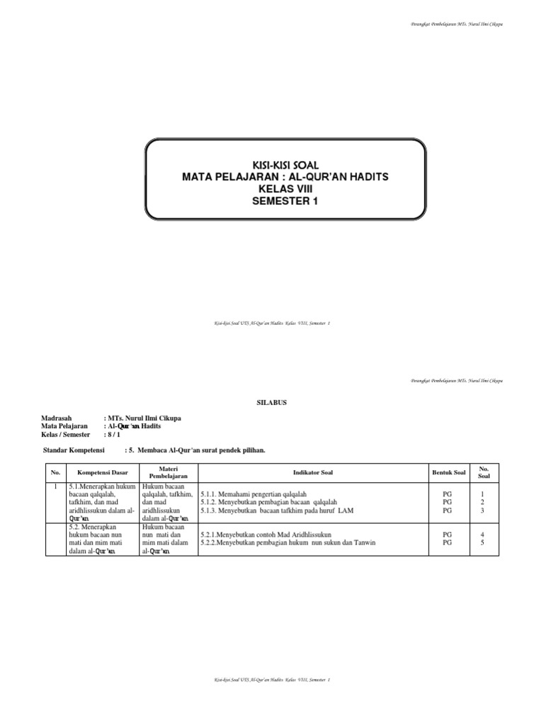 / Soal Uts Al Qur'an Hadits Kelas 8 Semester 2 - Contoh Soal Dan Kunci Tanggapan Qur An Hadis Sd Kelas 5 Idn Paperplane - Guru kelas 1 mi soal uts fiqih kelas 1 semester 1.